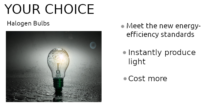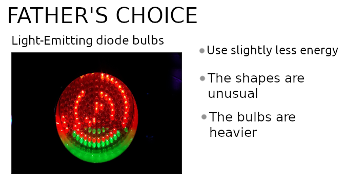 Your father is planning to replace Halogen bulbs in your house with Light-emitting diode bulbs but you think it’s not a good idea. Persuade your father why Halogen bulbs are more suitable, by comparing the two.